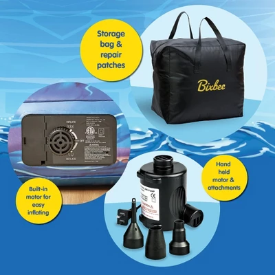 “Whether you have buccaneers swabbing the decks or you’re in need of lodgings for stowaways, the Bixbee Buccaneer Pirate Ship: Inflatable Mattress & Playspace is what the captain ordered! The multifunctional Buccaneer Pirate Ship Playspace will keep your hearties’ imaginations ignited during playtime and as an inflatable mattress, will help them rest easy on the open seas of dreamland.The detailed story-book graphics will have the matey’s reciting the Pirate’s Code and heading out on adventures through Bixbee’s Pirate Island. Mapped out on the ship’s deck, your pirates can head to the Parrot Shoppe to collect a new pet parrot or down to the Treasure Chest Wood Shoppe for a new treasure chest to hold all the goodies you will find. The fearless seadogs will use the inflatable toy ship’s wheel and sword to navigate Alligator Alley and befriend the sharks on Shark’s Beach.As an inflatable mattress, keeping sleeping quarters for stowaways has never been easier. With an integrated motor in base and self-closing valves, your guests can rest easy. When your hearties are finally ready to drop anchor and rediscover their sea legs, the Buccaneer Pirate Ship includes a bag for easy storage.Arrr-ours of fun ahead!”
