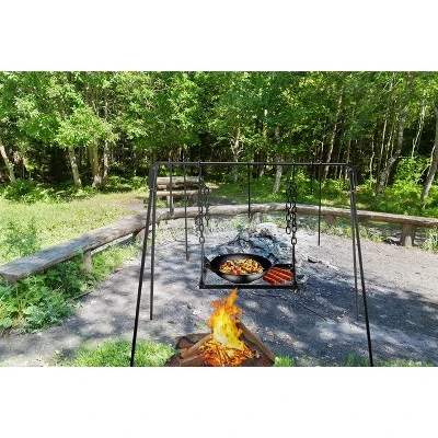 - Portable stand for Dutch oven cooking outdoors.