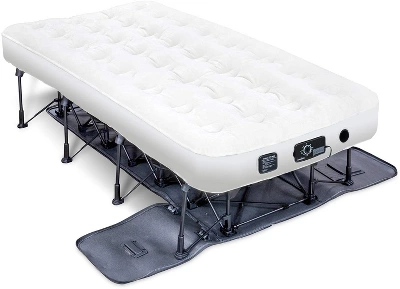 Real bed comfort, real world convenience Whether you are welcoming house guests or adventuring into the great outdoors, comfortable, quality sleep is easier than ever with the Ivation EZ-Bed inflatable mattress with legs. Set up this twin-sized air bed quickly and easily with its self-deploying frame and automated air pump. The integrated frame folds out to lift your blow up mattress off the ground, providing the comfort and feel of a permanent bed as you climb in and out. A puncture resistant, polyester top and internal coils work with 3 distinct comfort settings to provide a restful night of sleep. When you are done, simply fold the twin size air mattress back up into the portable, rolling duffel bag for easy transport and storage. You won’t even miss your everyday mattress with the Ivation EZ-Bed air mattresses with legs.