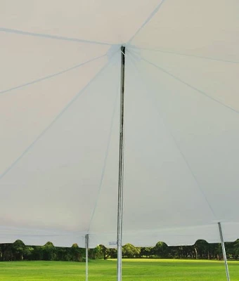 Pole tents are best suited for setup on grass or soft surfaces. If you wish to setup on concrete or asphalt, ask us about our Frame Tent options. Our 20′ x 20′ Weekender Standard Canopy Pole Tent features galvanized steel tent poles and a single-piece tent top, constructed from commercial-grade, 14oz translucent vinyl that is 100% waterproof and resistant to flame. All panels are bonded with 1″ heat-sealed overlapping seams and have scalloped valances bonded with vinyl binding. Guy ropes are spliced at all pole locations and the tent top also has sidewall ropes that are permanently installed, should you want to add sidewalls for added protection from the wind and elements (Sidewalls sold separately). This standard party pole tent will provide the perfect shelter for your next outdoor event! Great for weddings, rehearsal dinners, parties, graduations, and any outdoor event. No need for a truck or trailer to transport, these are lightweight and can be assembled with minimal tools quickly and easily! Please Note: It is only recommended that the supplied rope is used for staking. Ratchet straps are not recommended. Weekender Tents are recommended for residential (at home) usage but can be used for light commercial usage with professional installation. – Can accommodate up to 33 people for a sit down dinner, 40 people for buffet style dinner, 50 people for row seating, 80 people standing – 12′ 9″ tall, 7 foot tall legs – Great temporary shelter for short term events like patio or backyard BBQs, weddings, bridal parties, graduations and other weekend outdoor events. – Recommended to use a ground tarp for laying out the tent top prior to installation to prevent rips and tears from debris or sharp objects on the ground – Comes with 1 year limited manufacturer’s warranty against defects