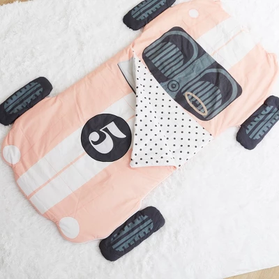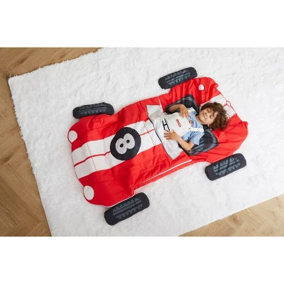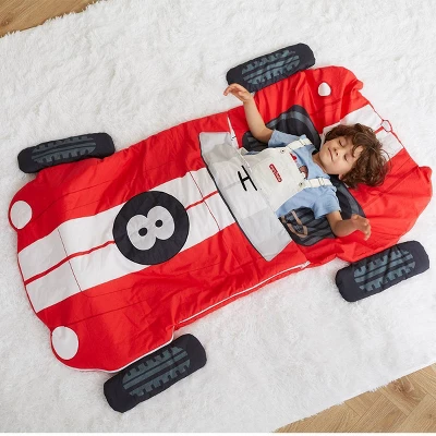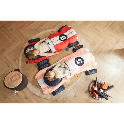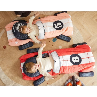Be off to the races…the slumber races, that is…in our Race Car Sleeping Bag. Comfy poly fill sleeping bag with amazing embroidered details, a chunky zipper that’s easy to zip and unzip, and a super puffy spare tire pillow will have them speeding to bed.